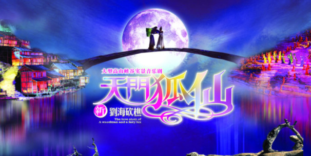 巍巍天門山,浩浩天門洞。雄偉奇峻的武陵山脈中,有一條長5公里、海拔高差1000余米的峽谷;峽谷內(nèi)芳草遍地,溪流潺潺,時有云霧自谷內(nèi)溢出,宛若現(xiàn)世桃源!短扉T狐仙—新劉?抽浴返闹魑枧_就與這奇峰、峽谷、森林、流瀑溶為一體,共同形成一個縱深數(shù)公里、橫寬和高差均逾千米、世界唯一的一座高山峽谷大舞臺!